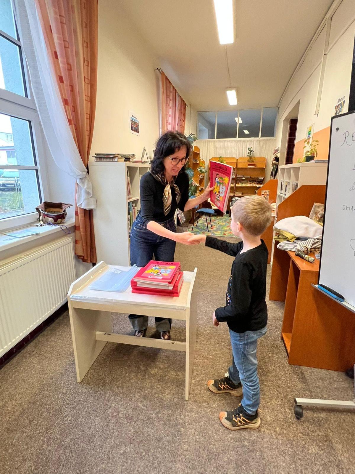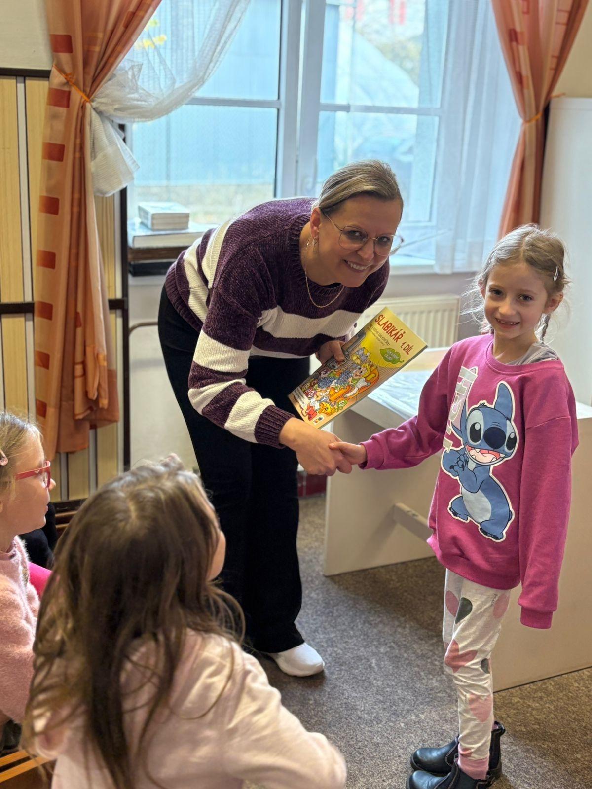 Paní knihovnice sehrály vtipnou scénku z pohádkové knížky a nakonec děti dostaly od třídních paní učitelek tu "svoji" důležitou knížku - Slabikář.