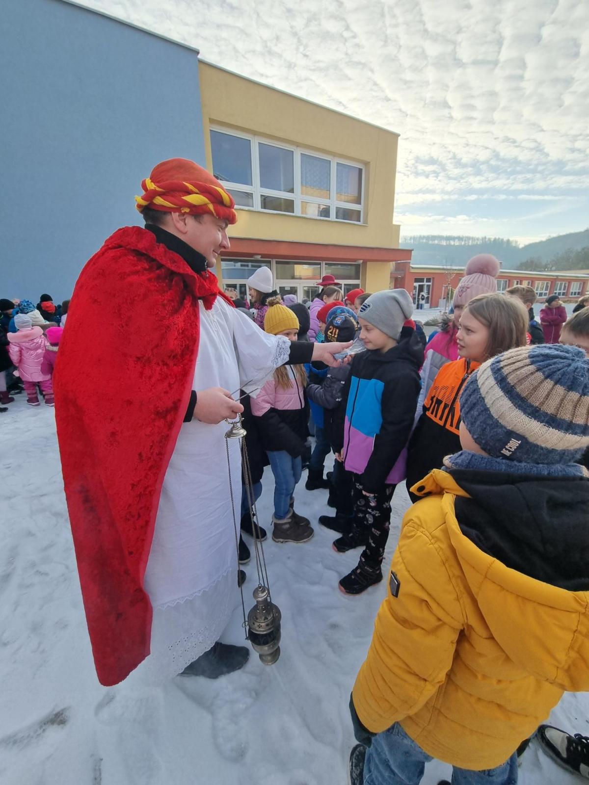 6. ledna 2026 navštívili naši školu tři mudrci, kteří vystoupili na pódiu na školním nádvoří.