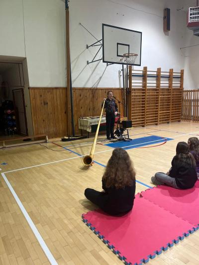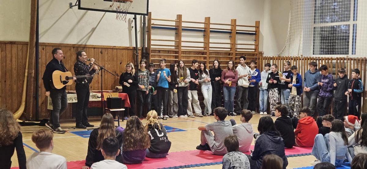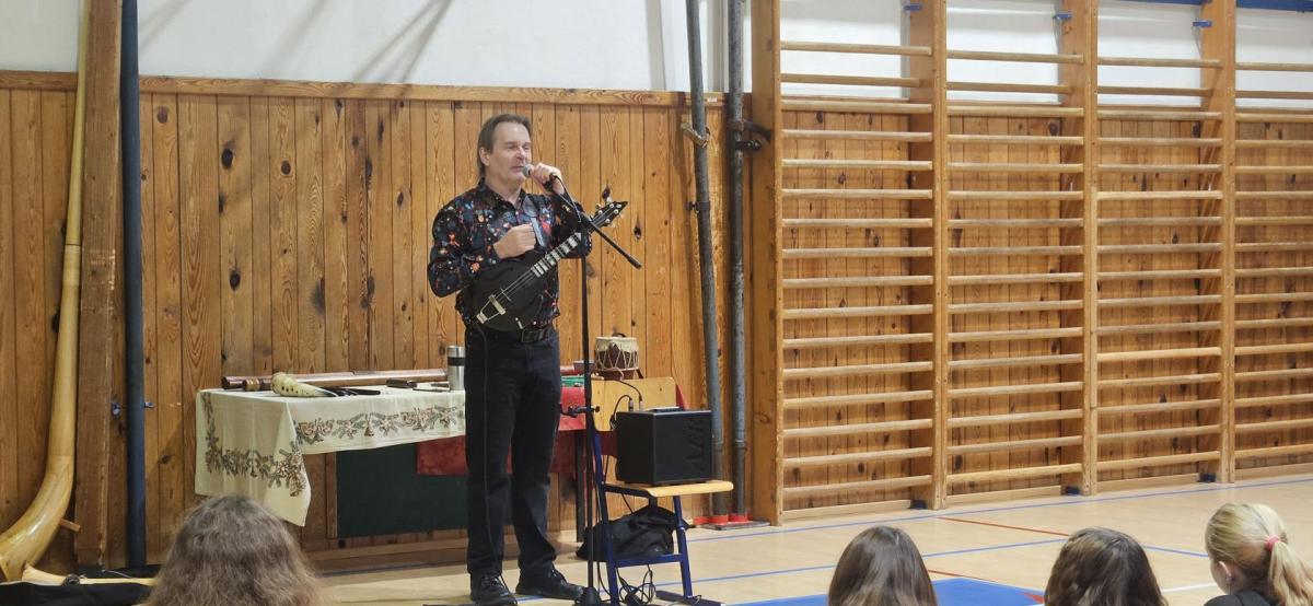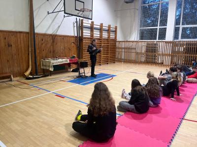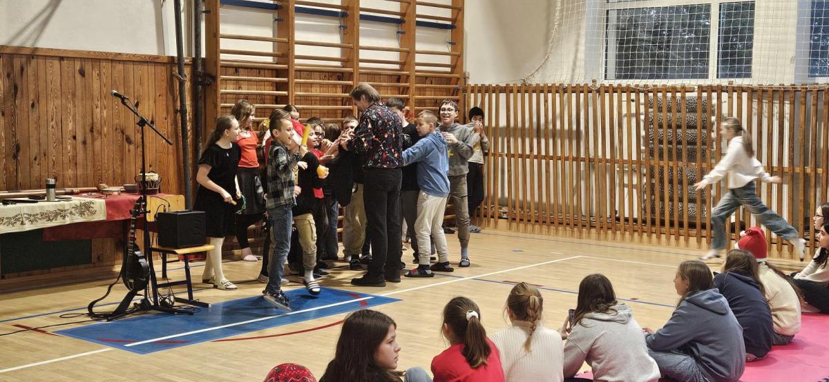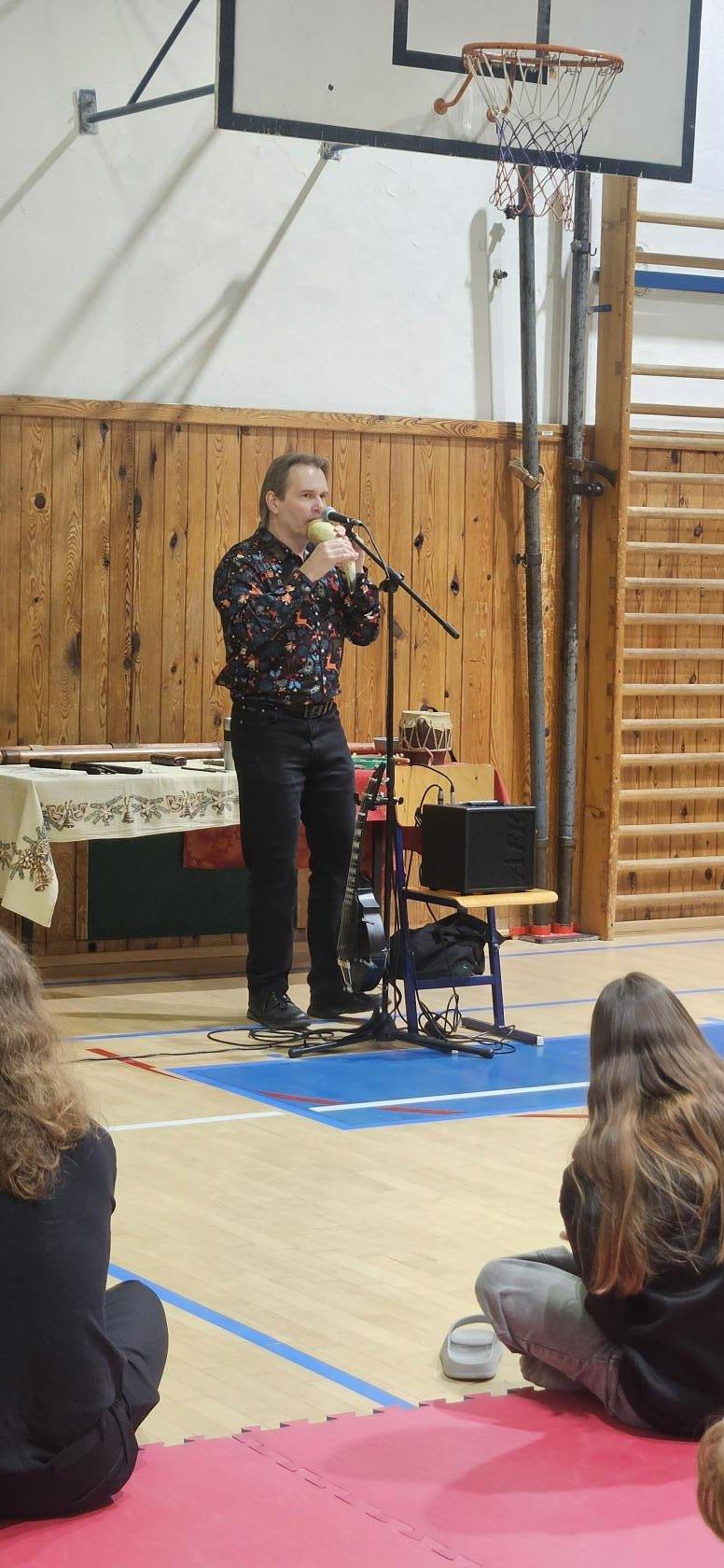 Pan Zenkl zahrál a zazpíval známé vánoční písně a koledy a na pomoc si přizval i dobrovolníky z řad našich žáků, při svém vystoupení vystřídal mnoho hudebních nástrojů.