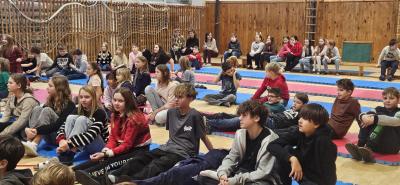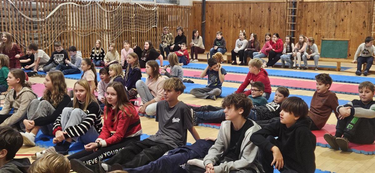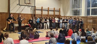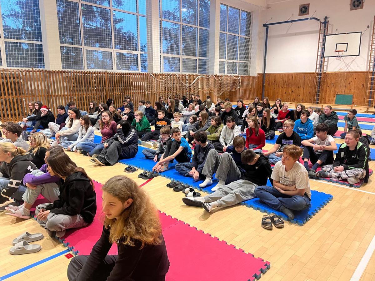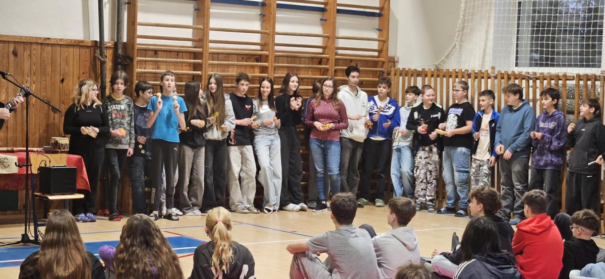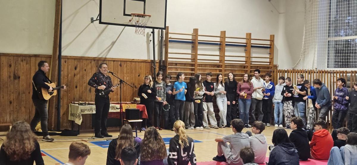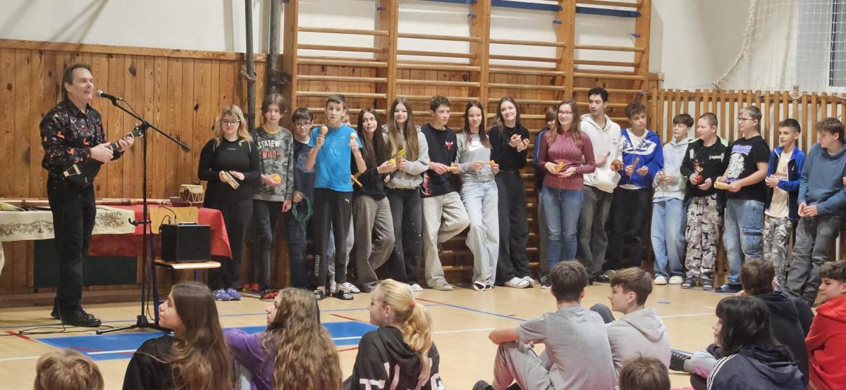 Pan Zenkl zahrál a zazpíval známé vánoční písně a koledy a na pomoc si přizval i dobrovolníky z řad našich žáků, při svém vystoupení vystřídal mnoho hudebních nástrojů.
